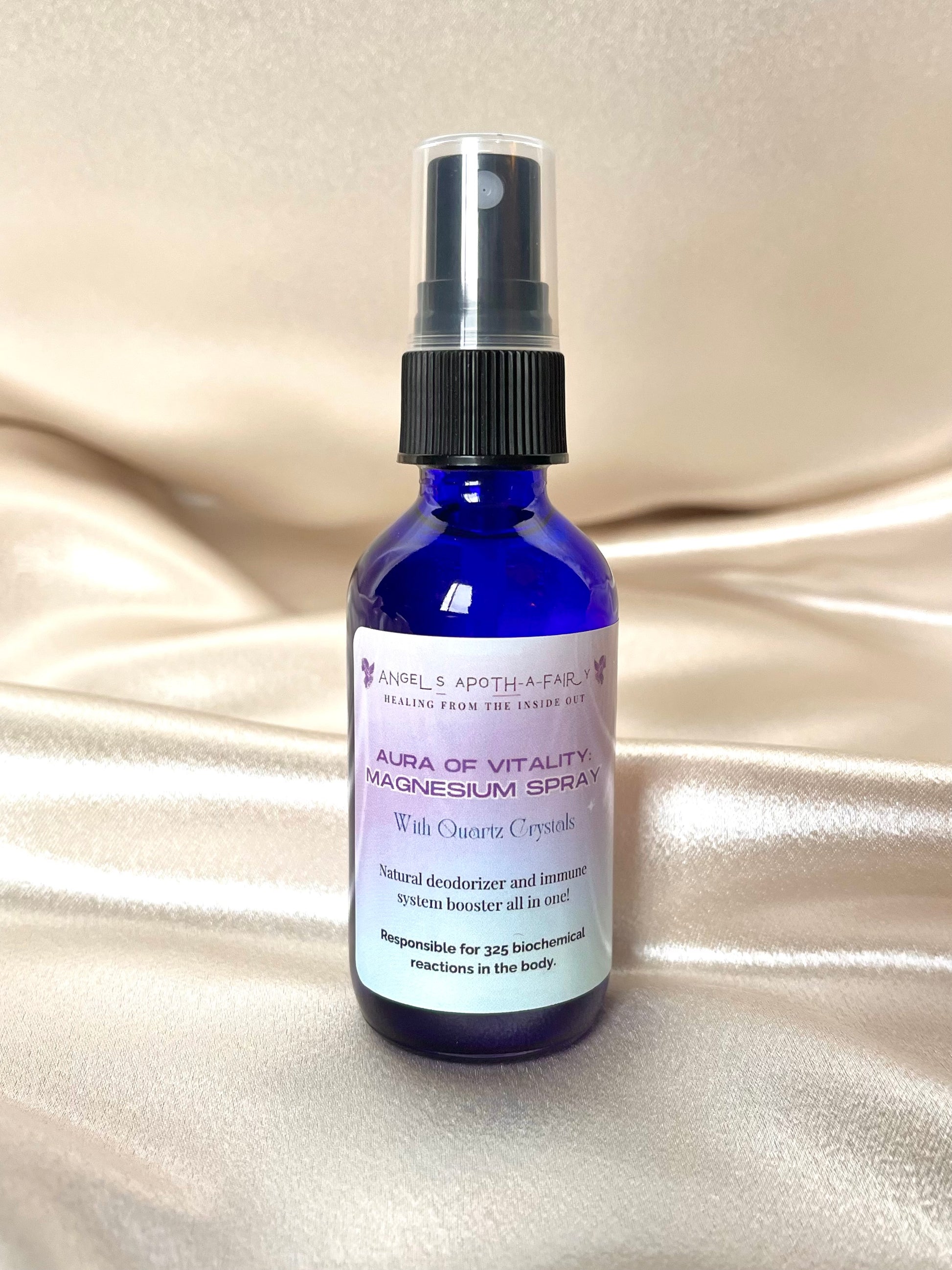*Aura of vitality: Magnesium Spray has a high magnesium content, tingly/itchiness may occur if you are magnesium deficient. Start with a few spritz on your stomach and feet daily. Never spray on fresh shaved skin.