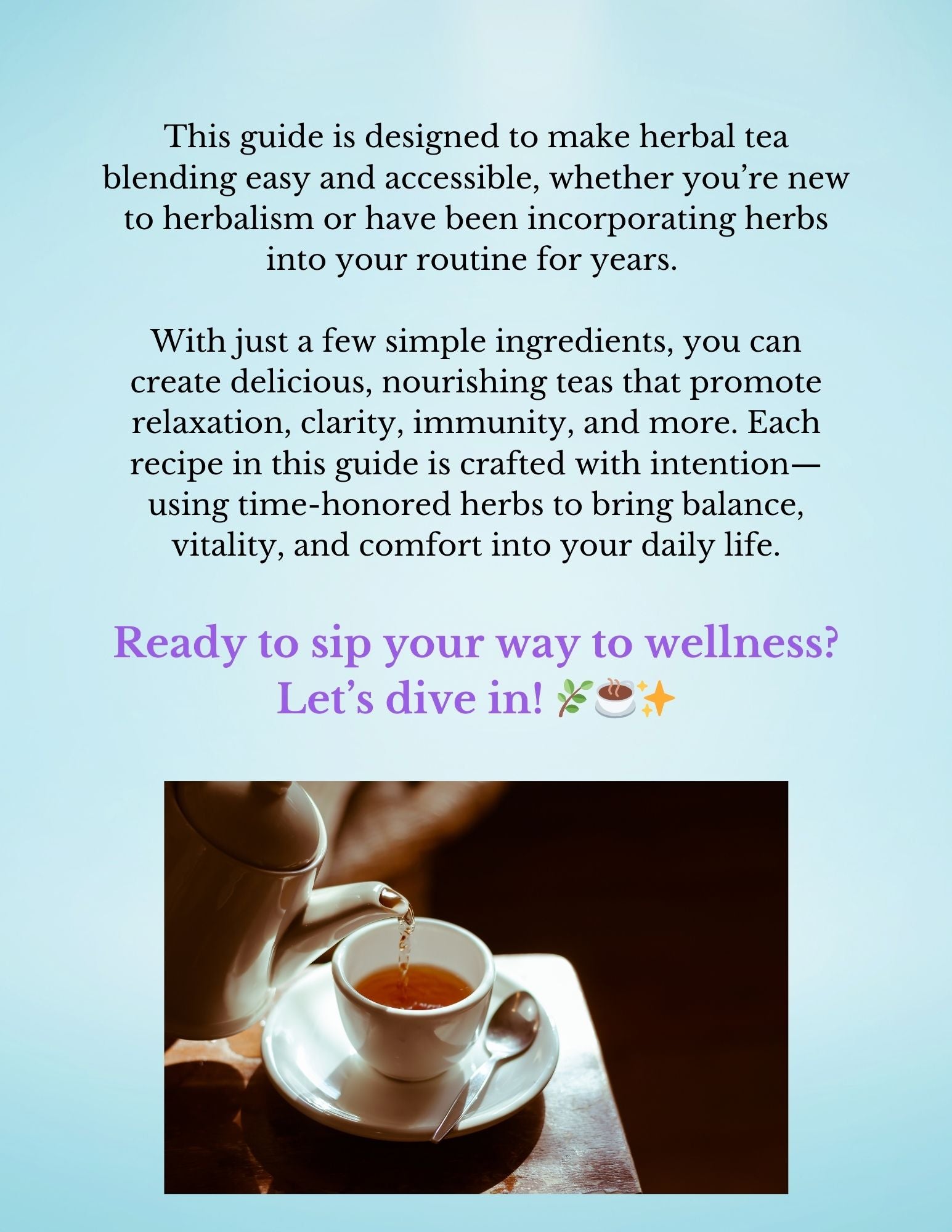 This herbal tea recipe book is your gateway to natural wellness, holistic healing, and mindful self-care—all in a warm, comforting cup of tea.